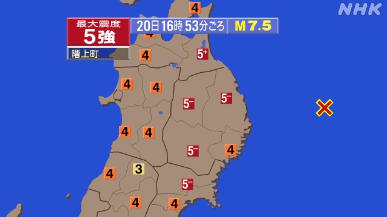 4月20日午後4時53分頃、青森県で震度5強を観測する地震が発生しました。震源地は三陸沖(北緯39.8度,東経143.2度)、震源の深さは10km、地震の規模を示すマグニチュードは7.4と推定されています。
