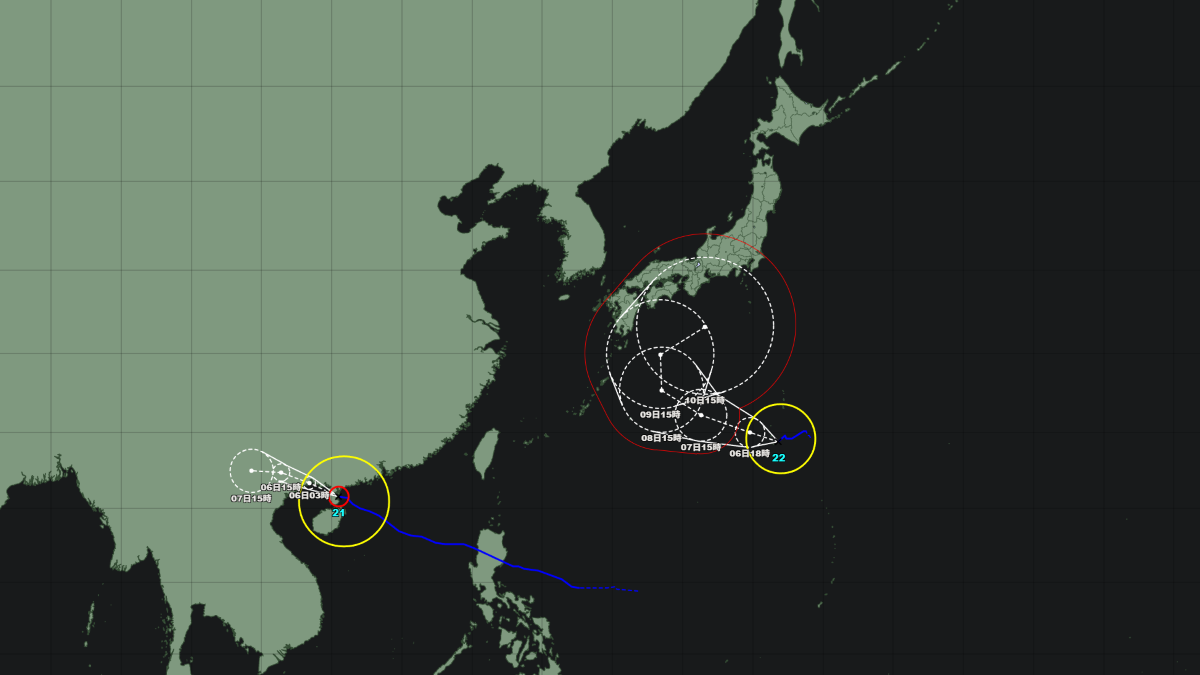 予報円の中心 | 北緯22度25分 (22.4度) 東経106度25分 (106.4度) |