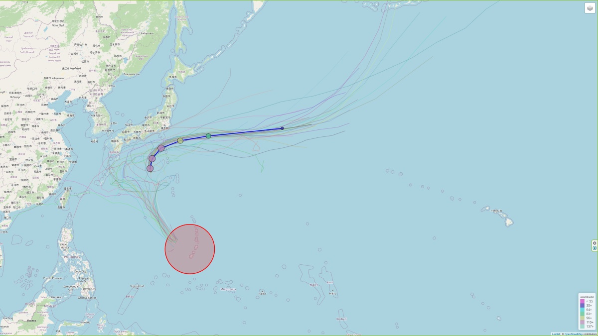 予報円の中心 | 北緯34度55分 (34.9度) 東経152度00分 (152.0度) |